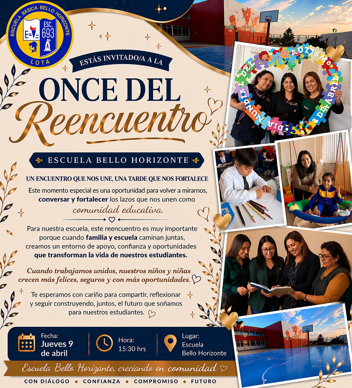 Les esperamos en nuestra Once de Reencuentro, un espacio creado para compartir, conocernos mejor y seguir construyendo, juntos, la comunidad que nuestros niños y niñas necesitan. Porque cuando familia y escuela se conectan, suceden cosas importantes: los estudiantes se sienten más seguros, se fortalecen los aprendizajes y crece el sentido de pertenencia. Y ahora queremos dar un paso más…